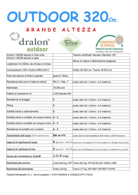 Gli articoli 140038 e 140039 sono tessuti OUTDOOR in GRANDE ALTEZZA Cm.320, resistenti, stabili e morbidi, perché prodotti completamente con filati in dralon®, da sempre garanzia di qualità e lunga durata.