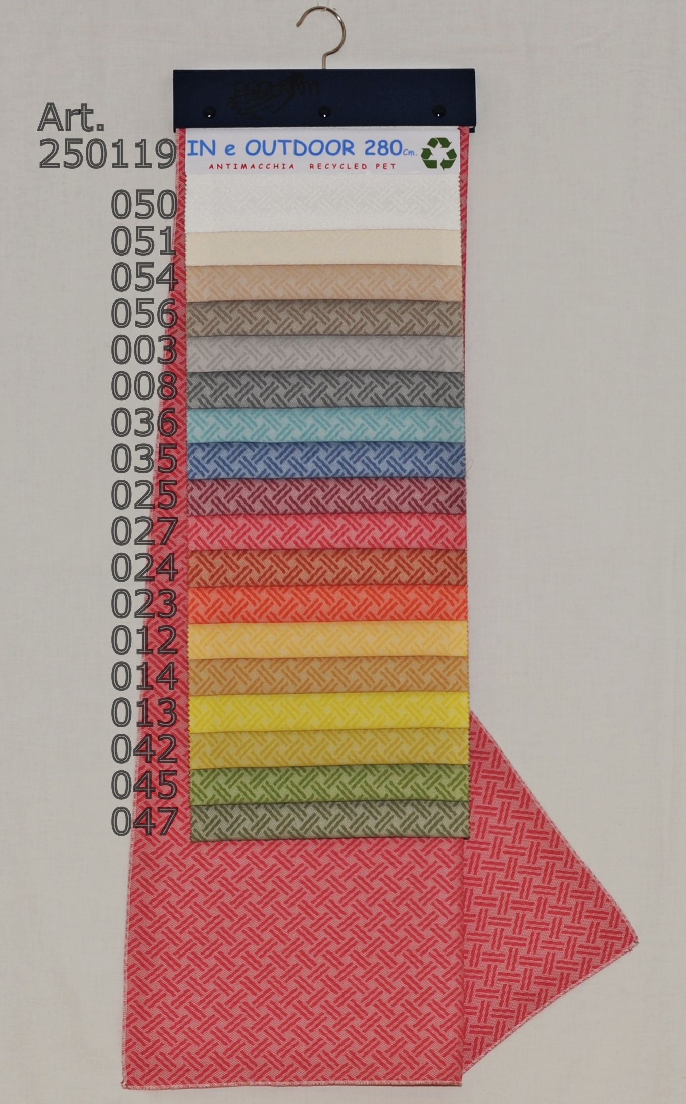L’articolo 250119 è uno straordinario tessuto IN e OUTDOOR in doppia altezza, di origine e fabbricazione tedesca garantita, realizzato con il 58% di PET riciclato ed il 42% di poliestere tradizionale.