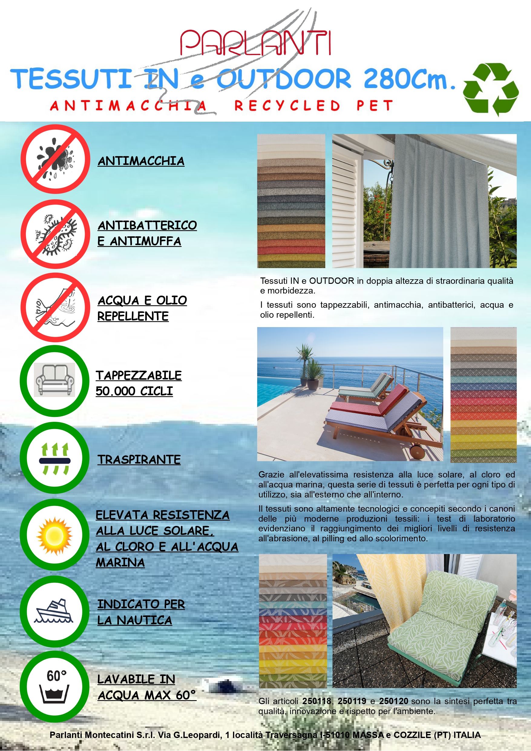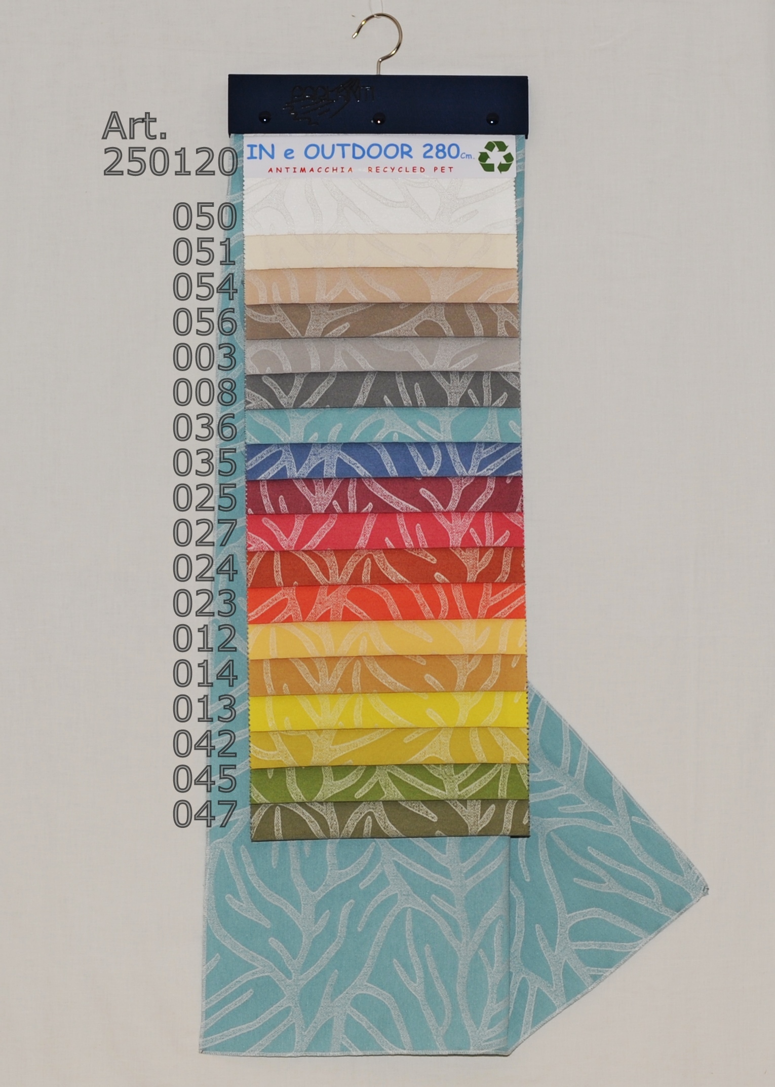 L’articolo 250120 è uno straordinario tessuto IN e OUTDOOR in doppia altezza, di origine e fabbricazione tedesca garantita, realizzato con il 58% di PET riciclato ed il 42% di poliestere tradizionale.