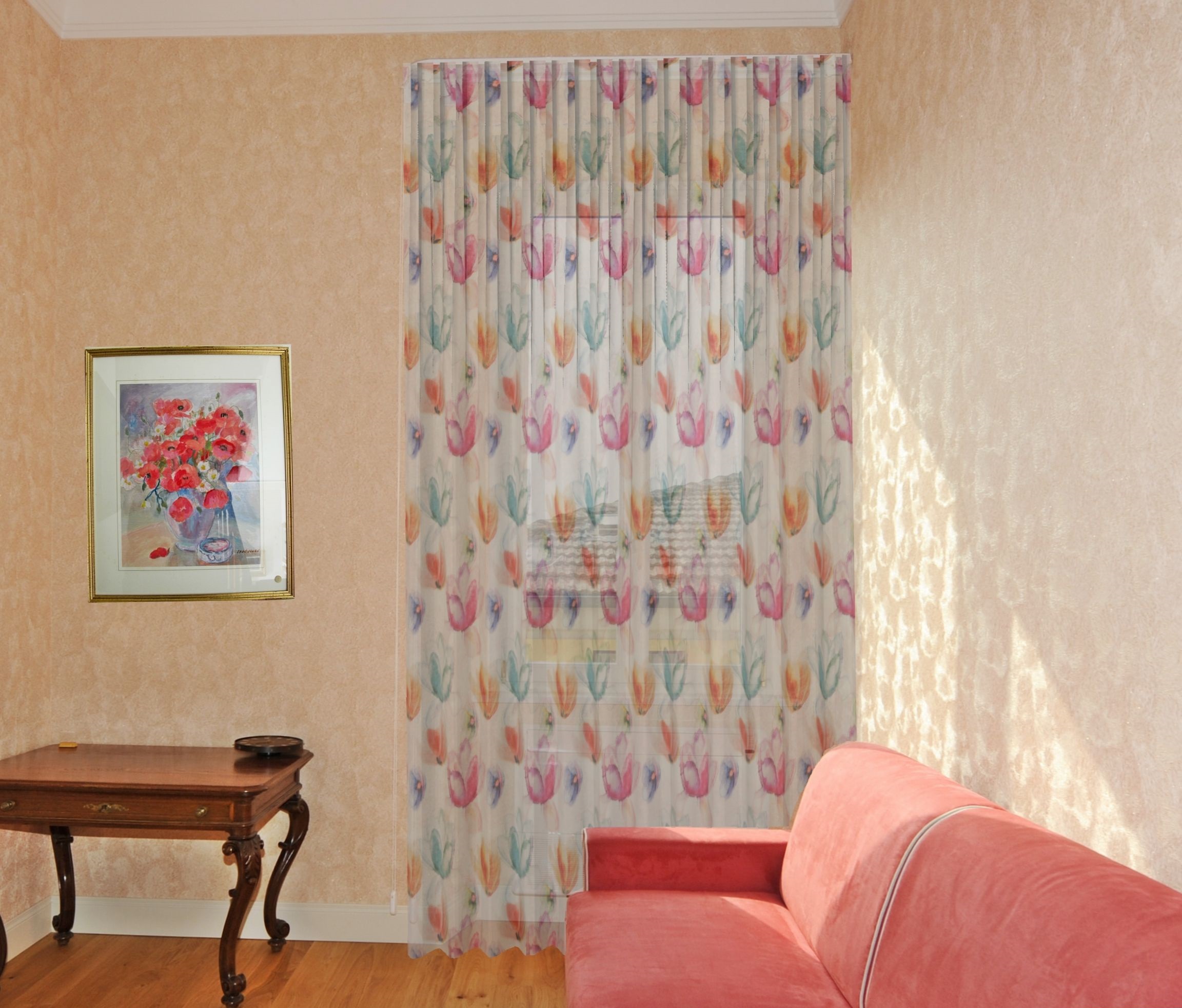 L’articolo 410012 è un tendaggio realizzato in circa 315 centimetri di altezza, stampato con tecnologia digitale su base in misto lino al 20%.